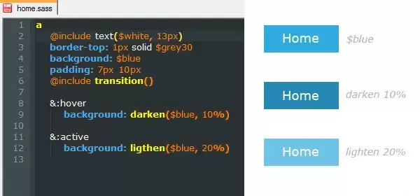 Voici deux exemples de fonctionnalités qui se retrouvent très utiles dans un web design, ce sont les fonctions « darken » et « ligthen » qui permettent d’assombrir ou d’éclaircir une couleur à partir d’une variable, et c’est génial ! Démonstration :