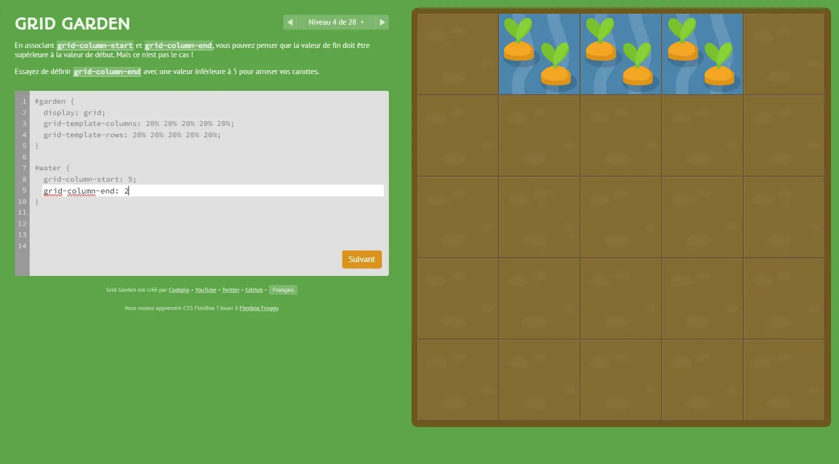 Avec le jeu en ligne Grid Garden, vous allez pouvoir apprendre tous les secrets du CSS Grid Layout de manière ludique et interactive. Ce petit jeu malin vous guide étape par étape à travers les différentes fonctionnalités de cette technologie CSS puissante et flexible.